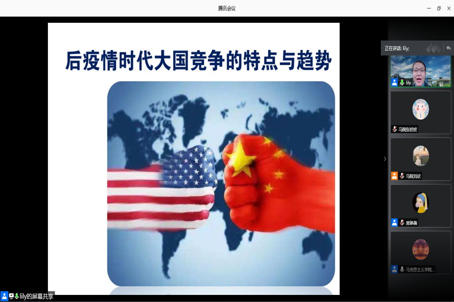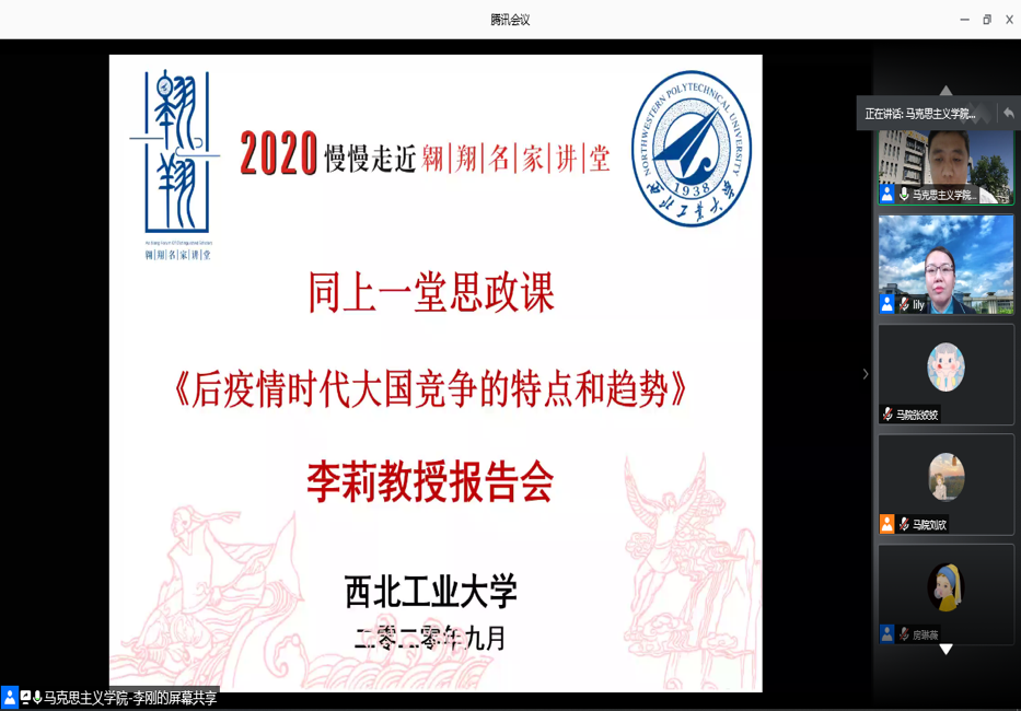 2020年9月11日下午15:00,中央人民广播电台特约军事评论员,冰球突破豪华版官方网站李莉教授应邀作客冰球官网翱翔名家讲堂,在腾讯会议网络平台为冰球官网广大师生带来一场主题为《后疫情时代大国竞争的特点和趋势》的精彩报告会。来自航空学院、航天学院、教育实验学院、微电子学院等近300名师生聆听了此次报告。本次翱翔名家讲堂由冰球突破豪华版官方网站党委学生工作部主办,冰球突破豪华版官方网站承办,冰球突破豪华版官方网站党委副书记李刚主持。
