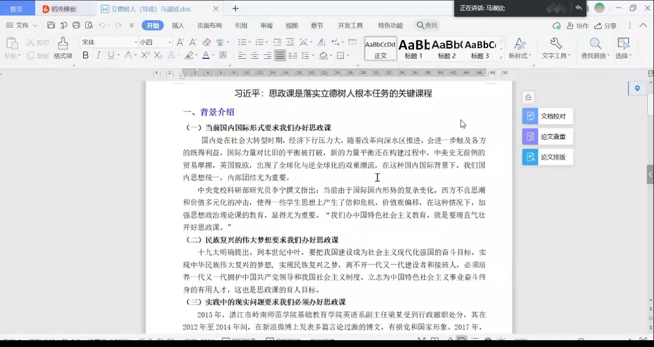 接着,我院硕士生黄清涛和博士生马淑欣作为原著文本导读人,先后就习近平总书记在2019年3月18日全国学校思政课教师座谈会上的讲话《思政课是落实立德树人根本任务的关键课程》进行了内容分析,带领大家解读其中的要点和难点。从讲话的背景介绍、内容概要、相关研究的拓展这些大方面,到立什么德、树什么人、思政课教师的“六个要”和思政课改革创新的“八个统一”这些具体方面,他们细致的导读让大家受益颇深。