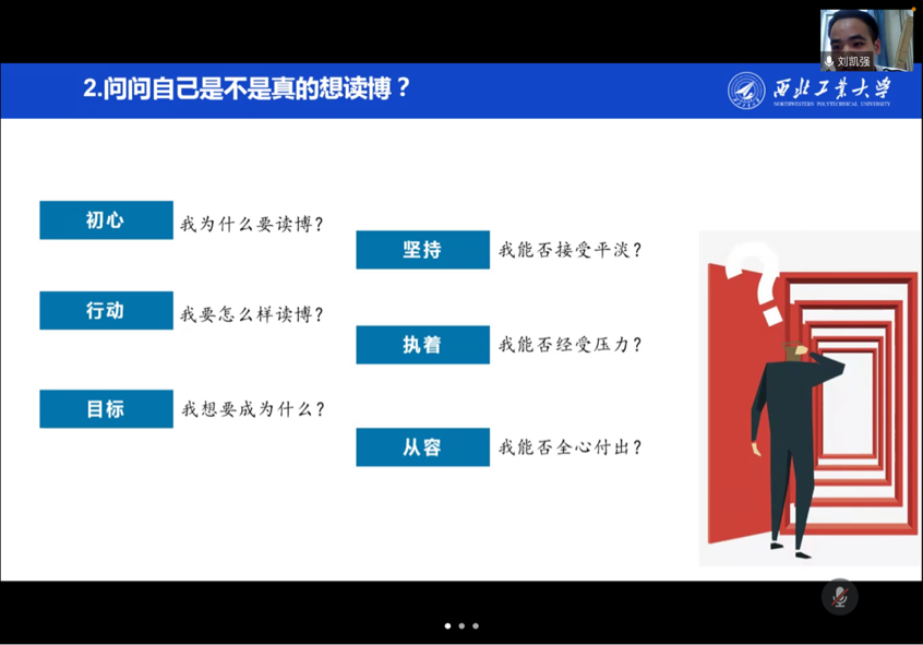 第三位分享的学姐是2014级思想政治教育专业的博士研究生张楠,目前就职于西北农林科技大学。会上,张楠为同学们分享了自己的高校就业经验,她谈到了入职高校的优势,还结合自身工作经历向同学们详细介绍了入职高校的方向及岗位,并围绕如何做好思政课教师做了进一步阐述。回首自己在西工大读博的六年时光,张楠给博士生提出了几点建议,一是要尽早开始大量阅读文献,了解专业前沿,确定研究方向;二是积极参与学校交流项目,丰富学习历经;三是参与课题研究和学术交流,认真完成学习任务;四是既然选择了读博就要坚持到底。