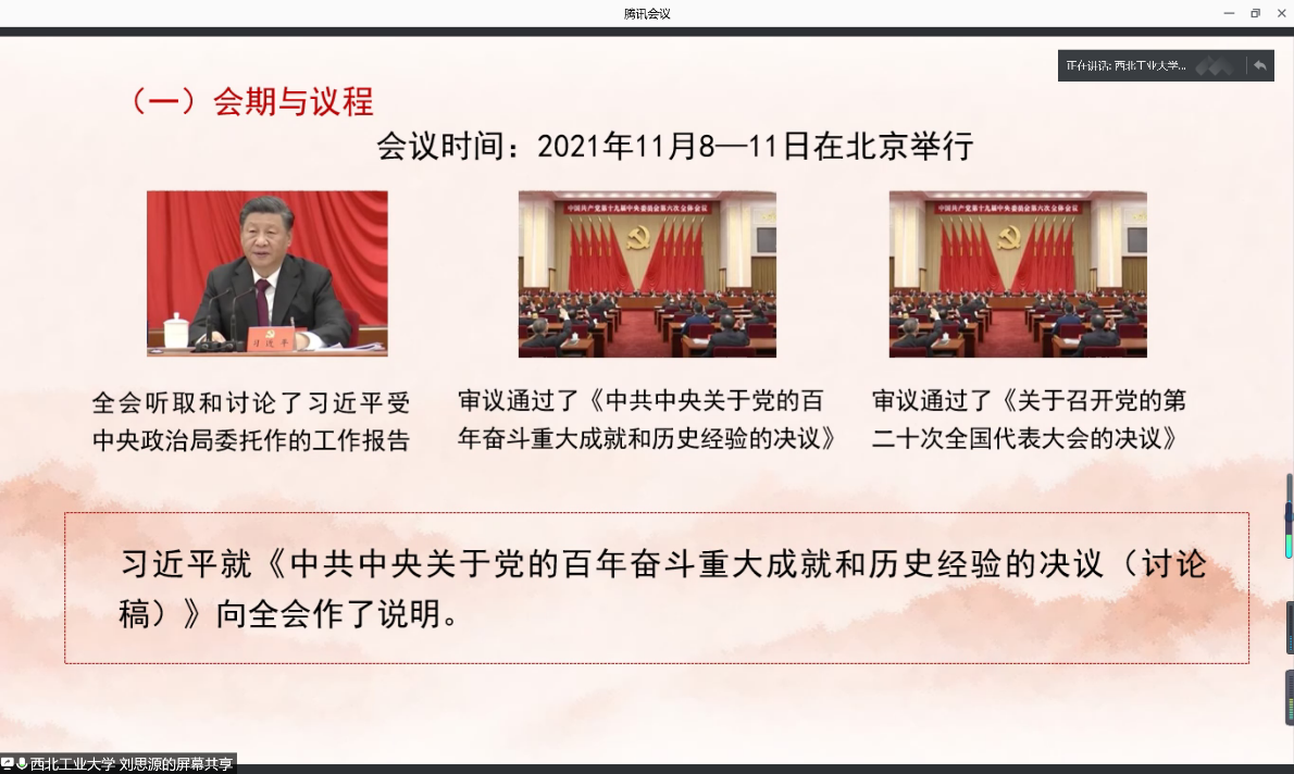 为深入学习十九届六中全会决议,推进习近平新时代中国特色社会主义思想进教材、进课堂、进头脑。2021年12月4日,冰球突破豪华版官方网站习近平新时代中国特色社会主义思想学习读书会第二十四期活动主题围绕《中共中央关于党的百年奋斗重大成就和历史经验的决议》进行学习研讨。本次读书会由我院思想政治教育系主任、博士生导师鲁杰教授发起,学院硕士生张昊主持,陕西师范大学冰球突破豪华版官方网站张帆教授作为对话教师应邀参加,学院党委副书记李刚老师全程参与读书会活动。
